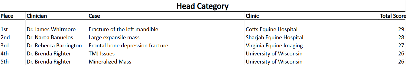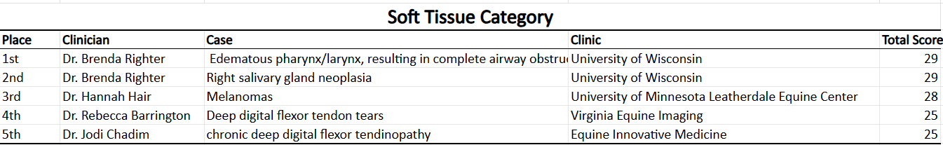 Below are the first-place winners by category, representing excellence in 3D reconstruction, limb imaging, head and neck diagnostics, soft tissue evaluation, and non-equine applications.